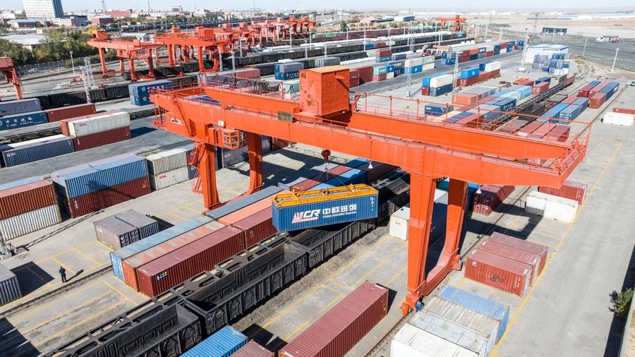 ??這是2023年10月18日在二連浩特鐵路口岸拍攝的中歐班列貨運(yùn)吊裝作業(yè)現(xiàn)場(chǎng)。新華社發(fā)(郭鵬杰 攝)