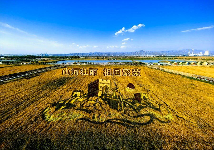 據(jù)講解員介紹,稻田畫種植,需要經(jīng)過彩稻選育、圖案設(shè)計(jì)、定點(diǎn)測繪、人工栽種、田間管理等環(huán)節(jié)。在栽種時(shí),要借助GPS定位插桿、牽線、畫輪廓,之后才能在相應(yīng)的位置插秧。這兩幅水稻畫,在不同的季節(jié),會(huì)呈現(xiàn)不同的色彩和景致。在中華人民共和國成立75周年到來之際,共同祝福偉大祖國繁榮昌盛。