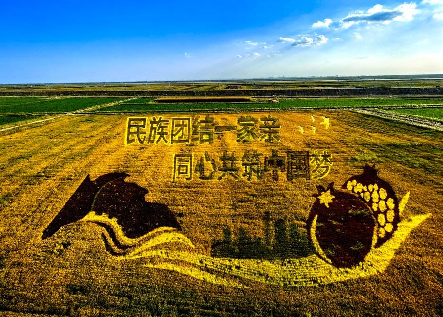 9月26日,內(nèi)蒙古包頭市東河區(qū)沙爾沁鎮(zhèn)什大股村,金色的稻浪掩映下,一幅壯美的稻田畫,在金秋時(shí)節(jié)格外引人注目。