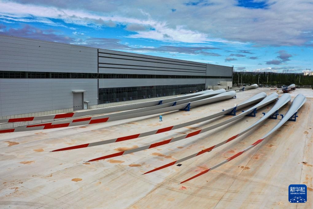 ??這是9月20日拍攝的位于鄂爾多斯市的株洲時代新材料科技股份有限公司蒙西分公司內(nèi)的風(fēng)機葉片(無人機照片)。