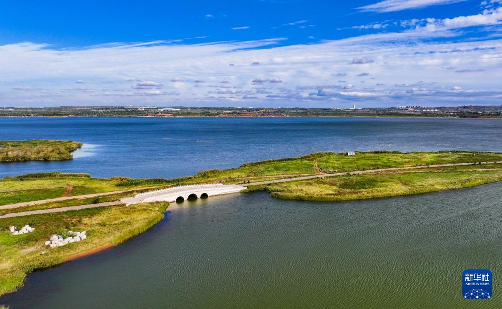 ??這是9月19日拍攝的鄂爾多斯市康巴什區(qū)烏蘭木倫湖與百康橋(無人機照片)。