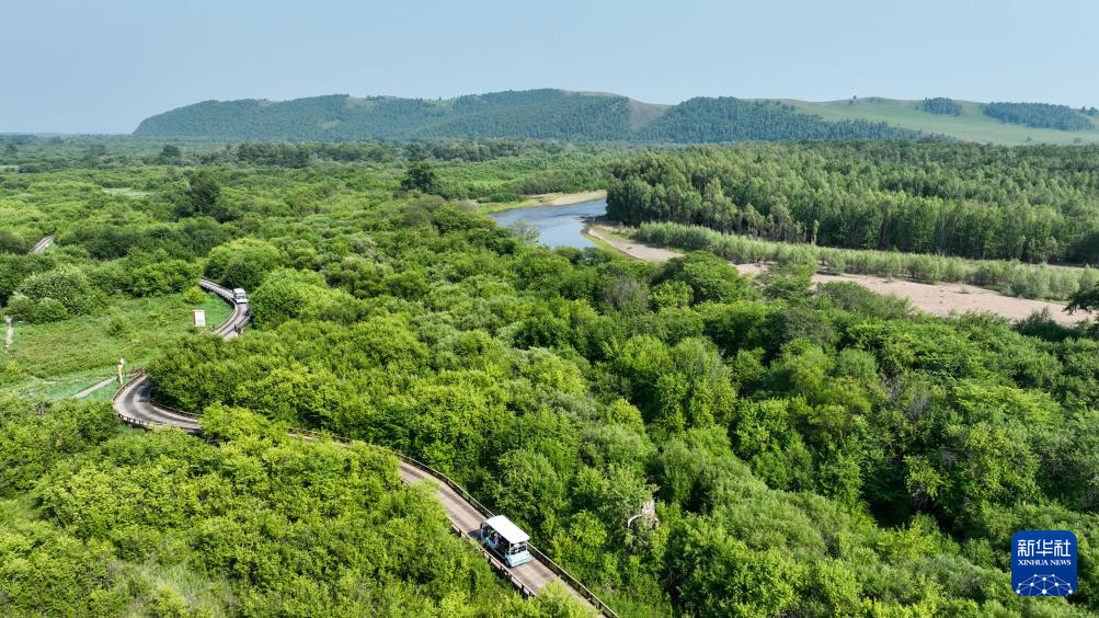 2024年7月2日,游客乘車(chē)在呼倫貝爾市額爾古納國(guó)家濕地公園游玩(無(wú)人機(jī)照片)。新華社記者 貝赫 攝