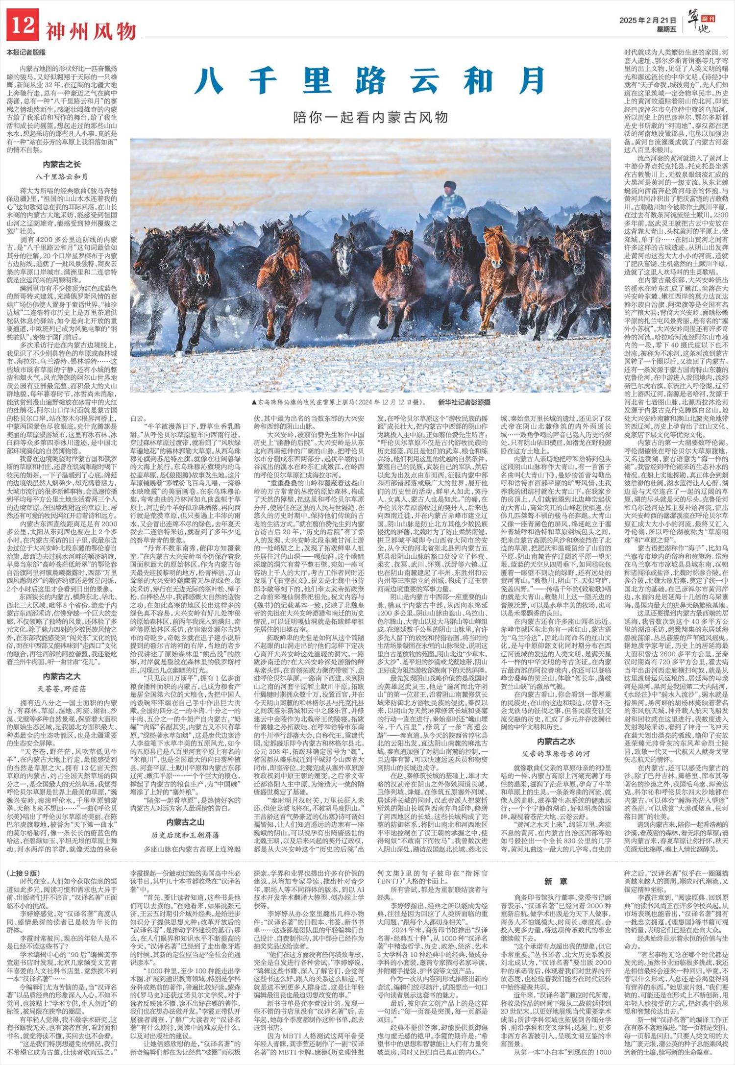 2025年2月21日《新華每日電訊》第12版整版刊發(fā)了《八千里路云和月 陪你一起看內(nèi)蒙古風(fēng)物》的文章,新聞從業(yè)32年,作者在遼闊的北疆大地上奔馳行走,感悟到內(nèi)蒙古的壯闊雄奇無處不在,一種“八千里路云和月”的寥廓之情油然而生。