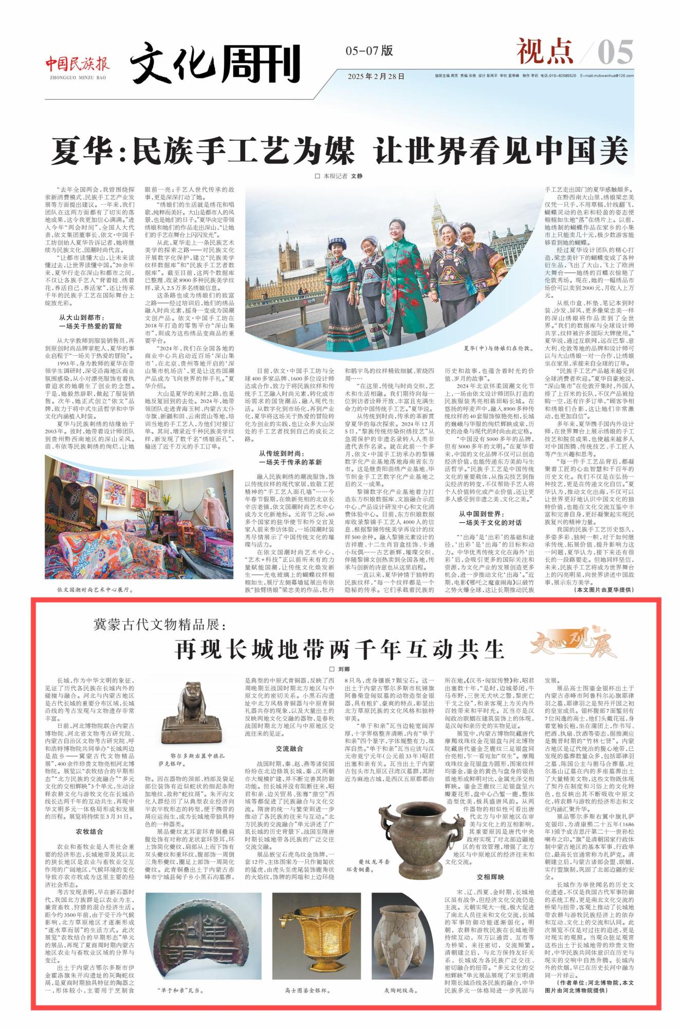 2025年2月28日,《中國(guó)民族報(bào)》第5版刊發(fā)題為《冀蒙古代文物精品展:再現(xiàn)長(zhǎng)城地帶兩千年互動(dòng)共生》的文章,報(bào)道了河北博物院聯(lián)合內(nèi)蒙古博物院、河北省文物考古研究院、內(nèi)蒙古自治區(qū)文物考古研究院、呼和浩特博物院共同舉辦“長(zhǎng)城兩邊是故鄉(xiāng)——冀蒙古代文物精品展”,400余件珍貴文物亮相河北博物院。