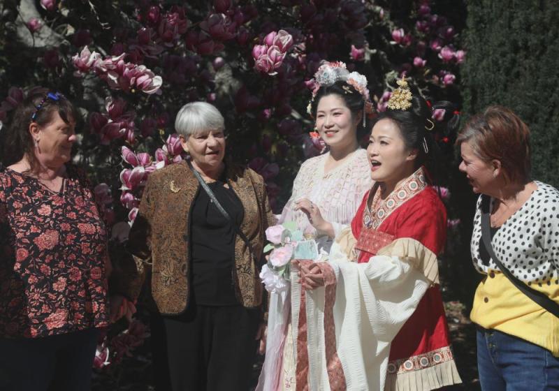 2025年3月1日,在美國(guó)伍德賽德的斐洛里莊園,漢服愛好者與游客在花朝節(jié)慶?;顒?dòng)上交流。新華社發(fā) 劉藝霖 攝
