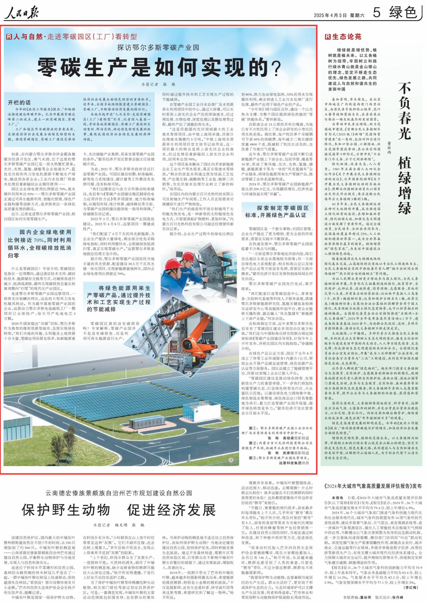 2025年4月5日,《人民日報》第5版刊發(fā)題為《探訪鄂爾多斯零碳產(chǎn)業(yè)園 零碳生產(chǎn)是如何實現(xiàn)的?》的文章,報道了鄂爾多斯零碳產(chǎn)業(yè)園通過可再生能源利用、智能化管理、綠色產(chǎn)業(yè)鏈構建等創(chuàng)新方式,逐步探索出一條綠色高質量發(fā)展的路徑。