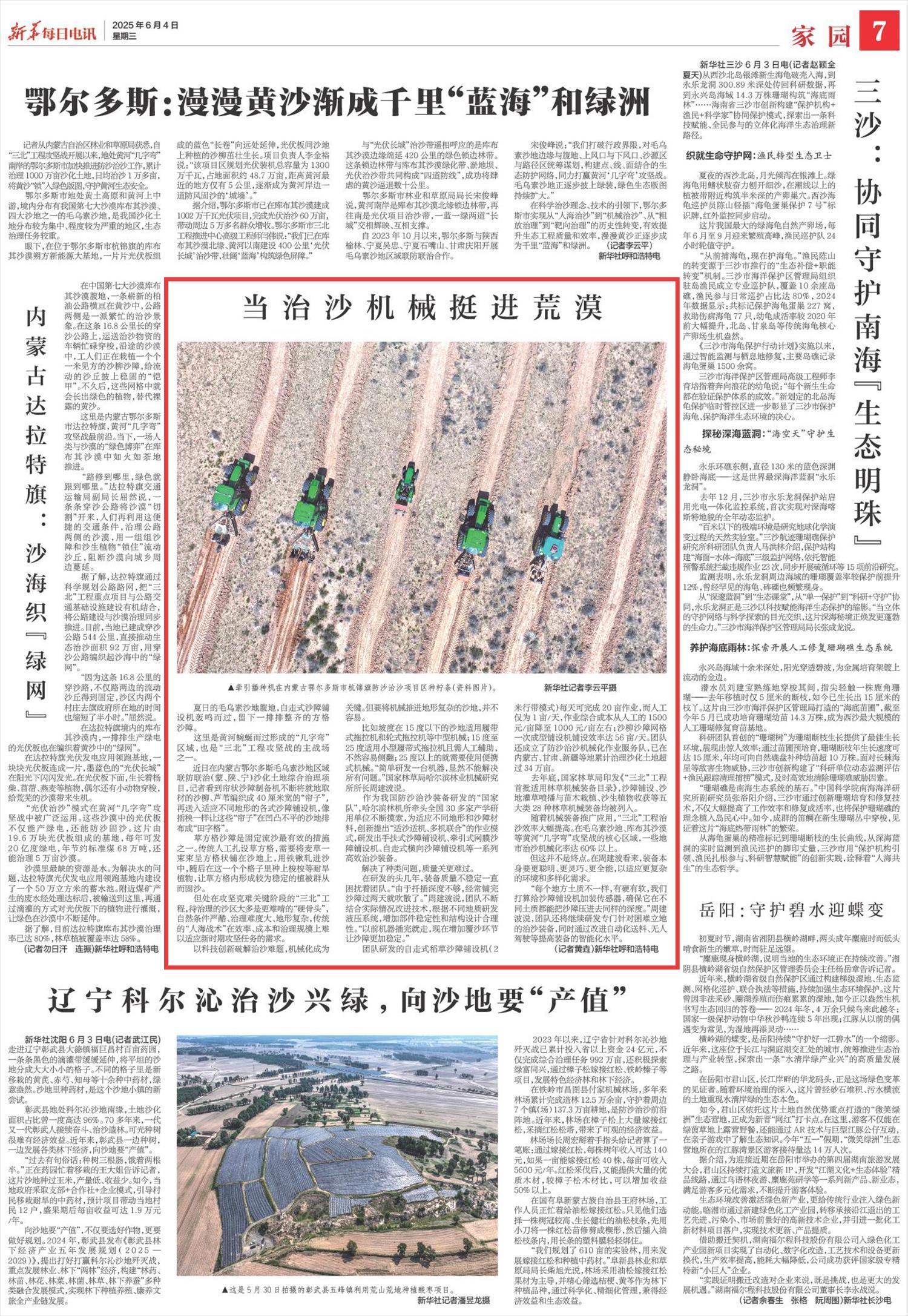 2025年6月4日,《新華每日電訊》第7版刊發(fā)題為《當治沙機械挺進荒漠》一文,報道了內蒙古鄂爾多斯毛烏素沙地區(qū)域聯(lián)防聯(lián)治(蒙、陜、寧)沙化土地綜合治理項目創(chuàng)新應用系列機械化沙障鋪設裝備,適應復雜地形,“三北”工程治沙效率大幅提高。毛烏素沙地、庫布其沙漠等黃河“幾字彎”攻堅戰(zhàn)的核心區(qū)域,一些地市治沙機械化率達60%以上。