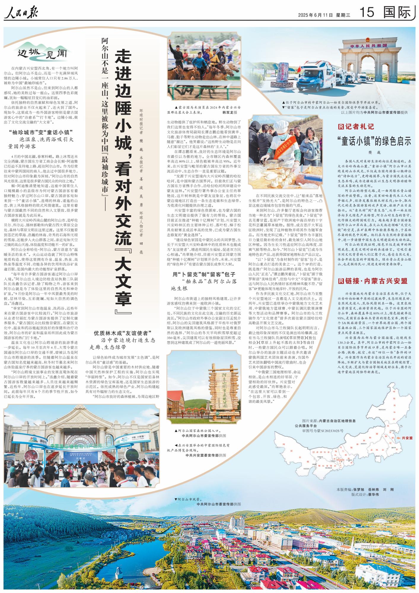 2025年6月11日,《人民日?qǐng)?bào)》第15版刊發(fā)整版文章《阿爾山不是一座山,這里被稱為中國(guó)“最袖珍城市”——走進(jìn)邊陲小城,看對(duì)外交流“大文章”》,報(bào)道了依托獨(dú)特的自然稟賦和綠色發(fā)展之道,阿爾山的旅游業(yè)火起來(lái)了?,F(xiàn)如今,這里成為一些外國(guó)游客特別是蒙古國(guó)游客心中的“治愈系”“打卡地”。邊陲小城,做出了文化交流交融的“大文章”。