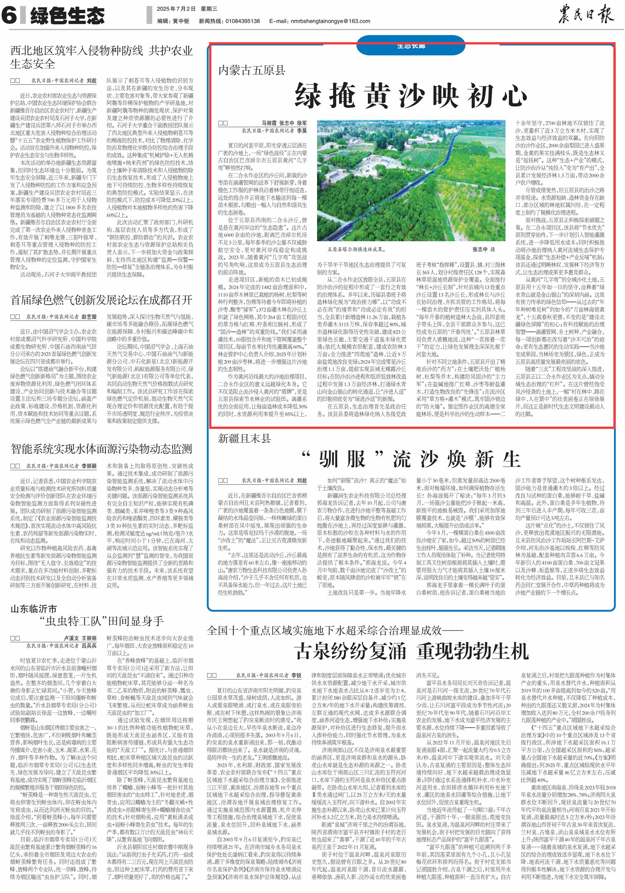 2025年7月2日《農(nóng)民日報》第6版刊發(fā)了《內(nèi)蒙古五原縣綠掩黃沙映初心》的文章,報道了從黃河“幾字彎”到全域沙化土地,內(nèi)蒙古自治區(qū)巴彥淖爾市五原縣用十五年如一日的堅守,詮釋著“綠水青山就是金山銀山”的深刻內(nèi)涵。當沙地變成果園,當林場變?yōu)榫皡^(qū),綠色,正成為五原縣高質(zhì)量發(fā)展最亮麗的底色。