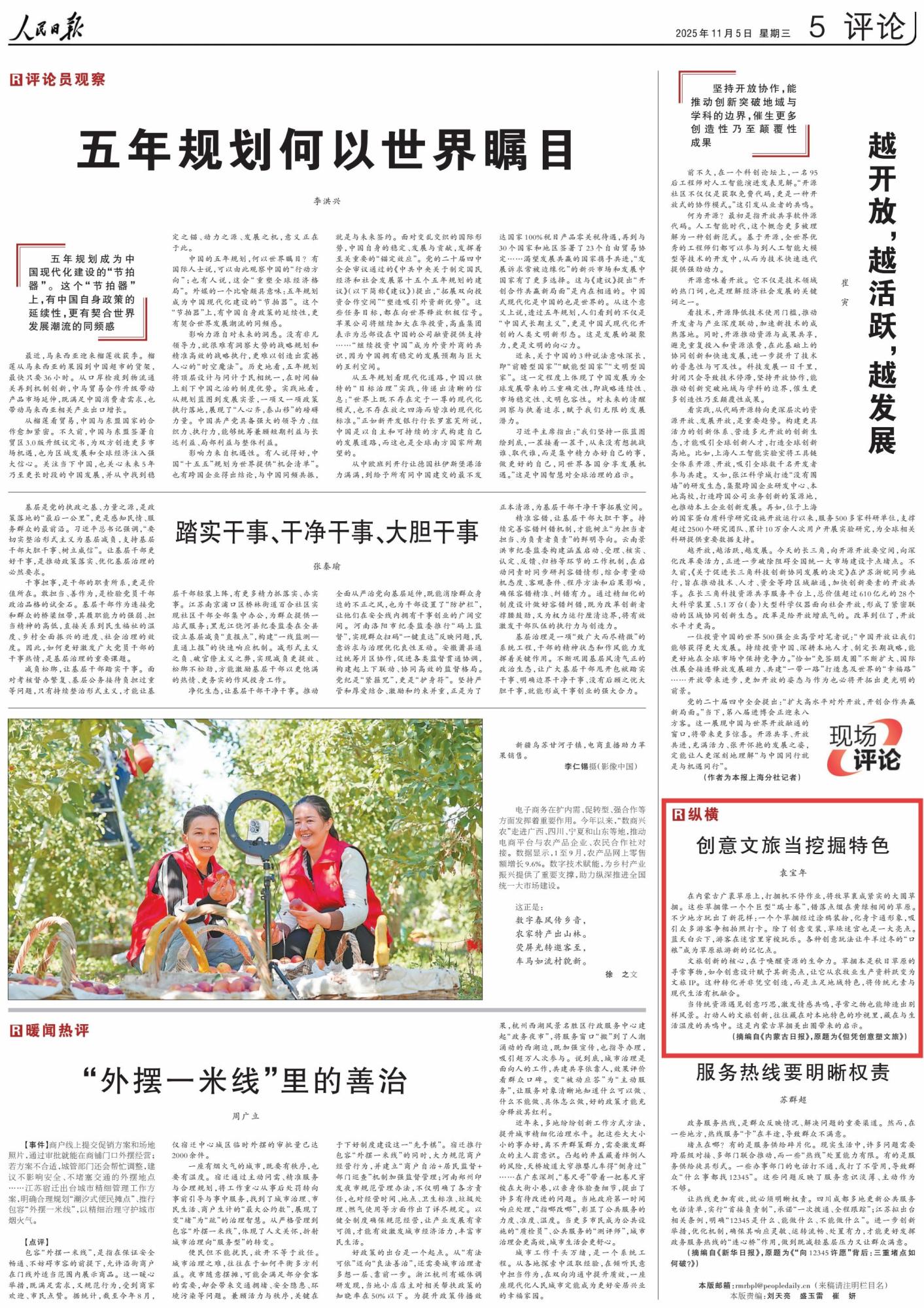 2025年11月5日,《人民日報》第5版刊發(fā)題為《創(chuàng)意文旅當(dāng)挖掘特色》的評論,評論通過講述不少地方將“瑞士卷”玩出了新花樣,強(qiáng)調(diào)文旅創(chuàng)新的核心,在于喚醒資源的生命力。