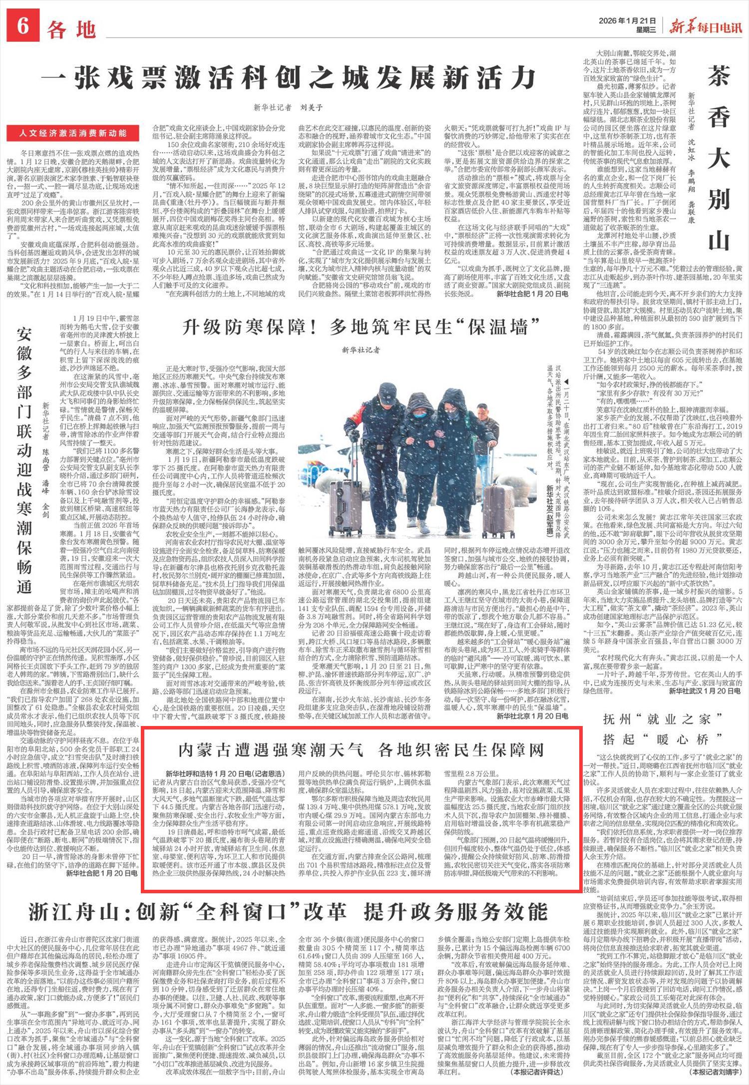 2026年1月21日《新華每日電訊》第6版刊發(fā)了《內(nèi)蒙古遭遇強(qiáng)寒潮天氣 各地織密民生保障網(wǎng)》的文章,報道了內(nèi)蒙古迎來大范圍降溫、降雪和大風(fēng)天氣,多地氣溫斷崖式下跌,最低氣溫達(dá)零下44.5攝氏度。各地各部門迅速行動,聚焦防寒保暖、安全出行、農(nóng)牧業(yè)生產(chǎn)等方面,全力保障群眾生產(chǎn)生活平穩(wěn)有序。