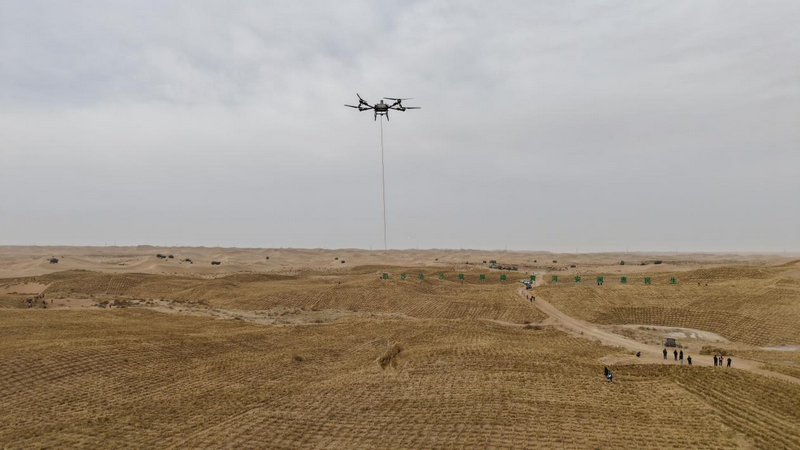 當(dāng)日上午10時,在黃河“幾字彎”西岸的項目現(xiàn)場,工程車輛整齊列隊蓄勢待發(fā),治沙工作者與建設(shè)人員精神抖擻,處處涌動著起步即沖刺、實干勇爭先的奮斗熱潮。隨著響亮的“開工”令下,現(xiàn)場機械轟鳴,打樁機精準(zhǔn)作業(yè),無人機吊運草料,手扶式沙障機忙著扎設(shè)草方格……阿拉善盟“十五五”時期生態(tài)建設(shè)的首場戰(zhàn)役——2026年“三北”六期工程攻堅戰(zhàn)全面打響。