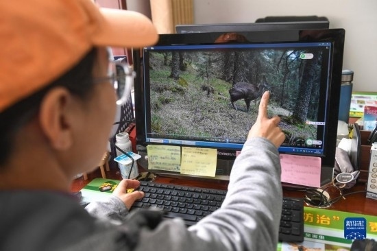 2月20日,在內(nèi)蒙古賀蘭山國(guó)家級(jí)自然保護(hù)區(qū)管理局,工作人員阿麗瑪展示紅外相機(jī)拍攝到的國(guó)家一級(jí)保護(hù)動(dòng)物馬麝。