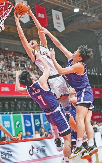 5月14日,北京首鋼籃球中心,回浦中學(xué)隊(duì)球員淡厚然(左二)在決賽中完成補(bǔ)籃。新華社記者 孟永民攝