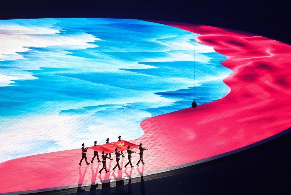 地屏上,一幅紅綢飛掠壯麗河山。8名儀仗兵步伐鏗鏘,護(hù)旗入場(chǎng)?!拔覑?ài)你中國(guó),我愛(ài)你春天蓬勃的秧苗……”動(dòng)人的贊歌深情唱響。