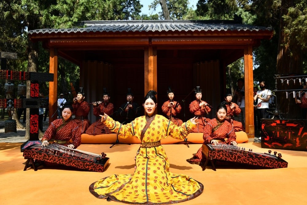 2023年6月27日,在曲阜孔廟,孔子博物館禮樂傳習(xí)所的工作人員進(jìn)行以《詩(shī)經(jīng)》為主題的雅樂表演。新華社記者 郭緒雷 攝