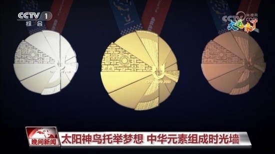 再來看圖案。獎牌正面設(shè)計賦予“太陽神鳥”羽翼幾何感,與賽會會徽“U”呼應,猶如神鳥振翅欲飛,寓意守護夢想,自信昂揚,飛往多彩未來。同時,在幾何扇面嵌入一塊包含多種中華文明代表元素為底紋的絢麗時光墻,以呈現(xiàn)中國五千年文明的璀璨輝煌和演變歷史。
