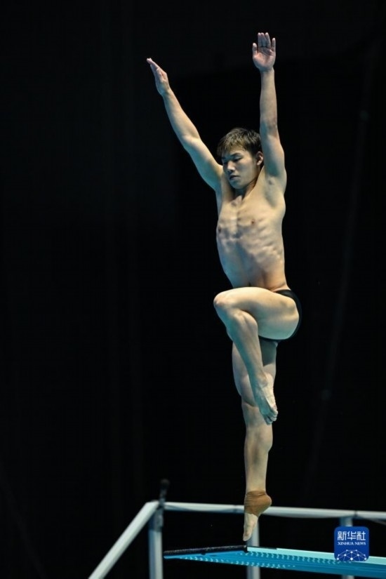 7月18日,中國選手鄭九源在三米板項(xiàng)目比賽中。