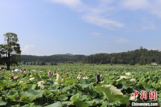 當(dāng)日晨間,驅(qū)車行駛在廣昌縣的鄉(xiāng)村公路上,兩旁荷葉如蓋、蓮花綻放的美景比目皆是。時(shí)逢周末,位于驛前鎮(zhèn)的“中國(guó)蓮花第一村”姚西村游人如織,民眾徜徉蓮池賞花、感受蓮作技藝、品味“蓮味”美食。