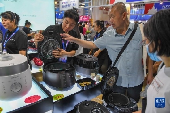 8月23日,在第十四屆中國(guó)—東北亞博覽會(huì)東北亞商品館,參展商向參觀者介紹韓國(guó)電器。