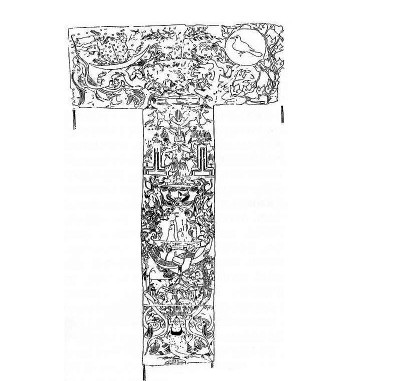 需要指出的是,這一進(jìn)程和墓主人辛追靈魂升仙的進(jìn)程是同步的。馬王堆漢墓T形帛畫(huà)的構(gòu)圖和漢代畫(huà)像石天界、人間、地下世界的三段模式非常近似,所以很多學(xué)者據(jù)此將T形帛畫(huà)也劃分為天界、人間、地下三部分。但這種看法我不贊成。我比較贊同T形帛畫(huà)的主題是引魂升天的主張。日本京都大學(xué)教授曾部川寬對(duì)漢代靈魂升仙的主題有非常深入的研究。1981年他出版的《向昆侖山升仙——古代中國(guó)人描繪的死后世界》(《崑崙山への昇仙——古代中國(guó)人が描いた死後の世界》)中,指出這幅非衣的主題就是升仙主題。整幅T形帛畫(huà)描述的是墓主人辛追升仙的進(jìn)程。從下到上,T形帛畫(huà)中央整個(gè)中軸貫穿著的是一個(gè)升騰的主題。陰陽(yáng)兩條龍自下而上在中央部分穿璧而過(guò),托舉起魂車(chē)。魂車(chē)上的核心人物通常認(rèn)為就是墓主人辛追。按照這一解釋?zhuān)虚g部分描繪的并不是我們生活的人間,而是從地下向天界升騰的墓主人辛追不斷升向仙界的魂魄。畫(huà)面上她的魂魄正被二龍牽引的魂車(chē)引向天門(mén)。從時(shí)間上說(shuō),辛追的魂魄將要進(jìn)入的,同樣是由死亡而再生的進(jìn)程。