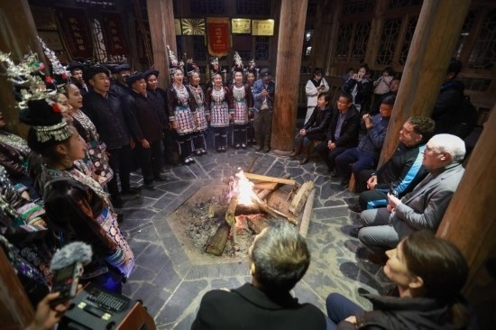 12月11日,榕江縣少數(shù)民族同胞用歌舞歡迎“學(xué)轉(zhuǎn)英超”培訓(xùn)團(tuán)隊(duì)。新華社記者 劉續(xù) 攝