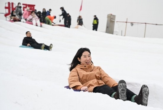 冬季的內(nèi)蒙古賽馬場變成了冰雪樂園,場地中間建起一座十幾米高的人造雪山,等著玩滑雪圈的人群從山頂一直排到山腳下,周圍還有冰上腳踏車、冰上陀螺等冰雪體驗(yàn)設(shè)備。曹博雅坐著雪圈從山頂飛速滑下,又拉著爸爸坐上了旋轉(zhuǎn)小雪車。