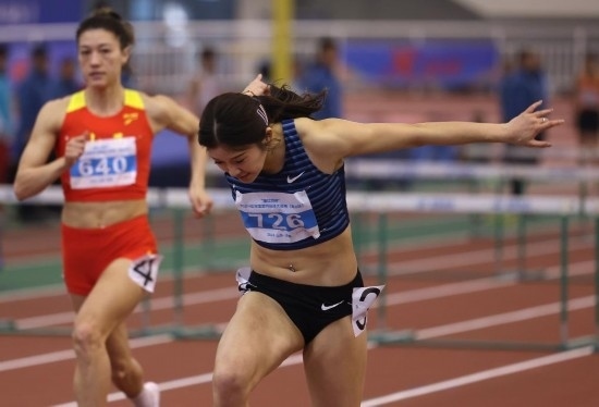 3月13日,四川隊(duì)選手吳艷妮(右)在女子60米欄決賽中沖刺撞線(xiàn)。新華社記者 廖宇杰 攝