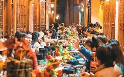 越南游客還品嘗了頗具特色的將軍府凱旋宴。40余張木桌沿街擺放,熱氣騰騰的烏鎮(zhèn)特色土火鍋和各色菜品擺滿了桌面,耗兒魚、鮮菌菇拼盤、嫩滑牛肉等美食令人垂涎欲滴,越南游客圍坐在一起,享受美味盛宴。