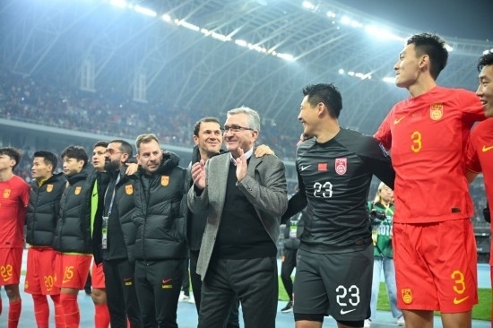 3月26日,中國隊主教練伊萬科維奇(右四)與隊員慶祝比賽勝利。新華社記者 孫凡越 攝
