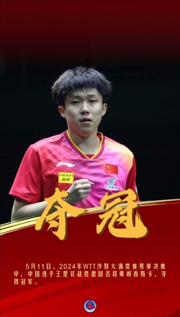 今天,在2024年WTT沙特大滿貫賽男單決賽中,中國選手王楚欽戰(zhàn)勝德國名將弗朗西斯卡奪冠。王楚欽此前分別搭檔隊友孫穎莎、馬龍奪得混雙、男雙冠軍。(記者:王海洲)