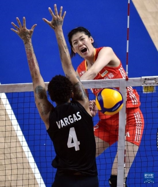 6月15日,中國隊球員王媛媛在比賽中扣球。新華社記者盧炳輝攝