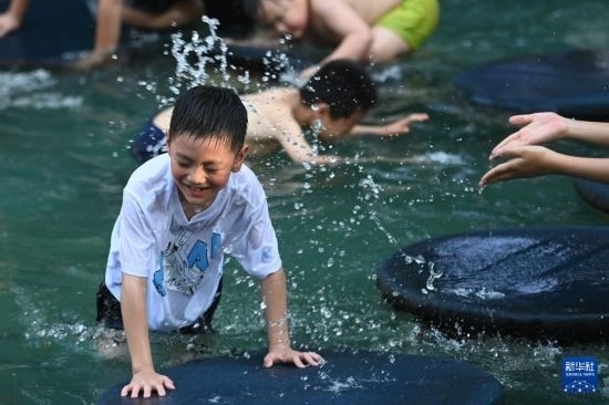 7月5日,小朋友在杭州宋城景區(qū)戲水。