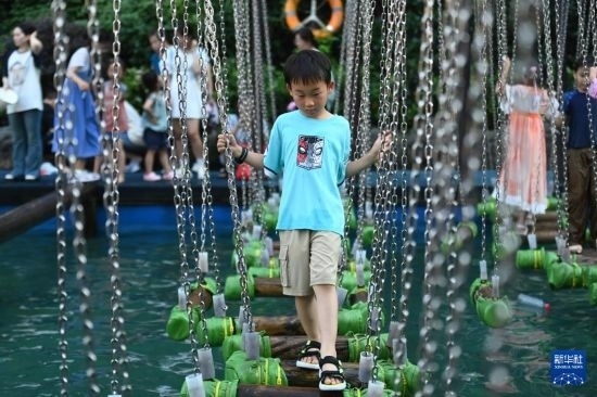 7月5日,小朋友在杭州宋城景區(qū)體驗水上游樂項目。