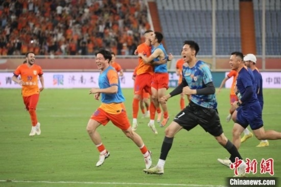 山東泰山隊(duì)點(diǎn)球大戰(zhàn)取勝,隊(duì)員沖進(jìn)場(chǎng)內(nèi)慶祝。中新社發(fā) 陳陽(yáng) 攝