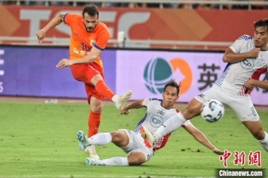 山東泰山隊(duì)卡扎伊什維利(左一)在比賽中射門。中新社發(fā) 陳陽(yáng) 攝