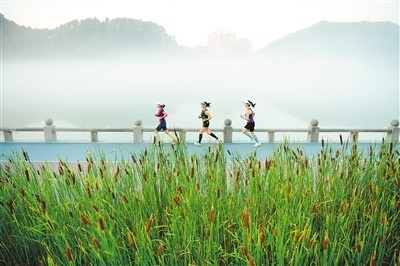 健身愛好者在浙江省建德市新安江畔的新安綠道上跑步。寧文武攝(新華社發(fā))