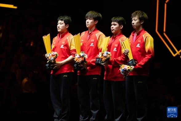 10月5日,冠軍王楚欽(左二)/梁靖崑(左一)和亞軍林高遠(右一)/林詩棟在頒獎儀式上。新華社記者 肖藝九 攝