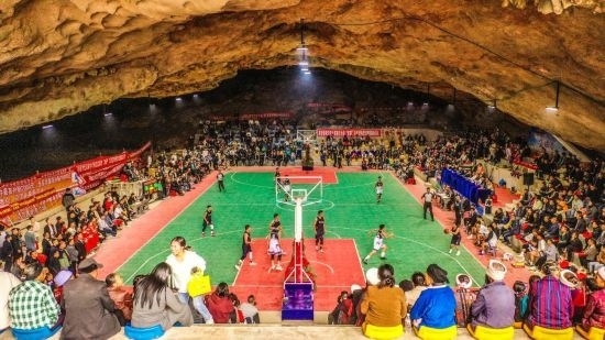 在村里一處溶洞修了一塊籃球場(chǎng)