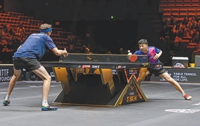 WTT中國(guó)大滿貫賽,中國(guó)選手馬龍(右)在比賽中。本報(bào)記者 張武軍攝