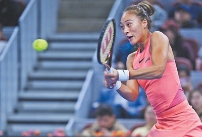 2024年中國(guó)網(wǎng)球公開(kāi)賽女單1/4決賽,中國(guó)球員鄭欽文在比賽中回球。新華社記者 張 龍攝