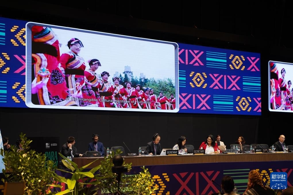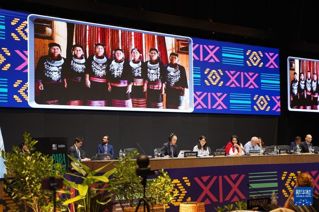 12月5日,在巴拉圭亞松森聯(lián)合國教科文組織保護非物質文化遺產(chǎn)政府間委員會第19屆常會評審現(xiàn)場,大屏幕播放“黎族傳統(tǒng)紡染織繡技藝”宣傳視頻。新華社記者 朱雨博 攝