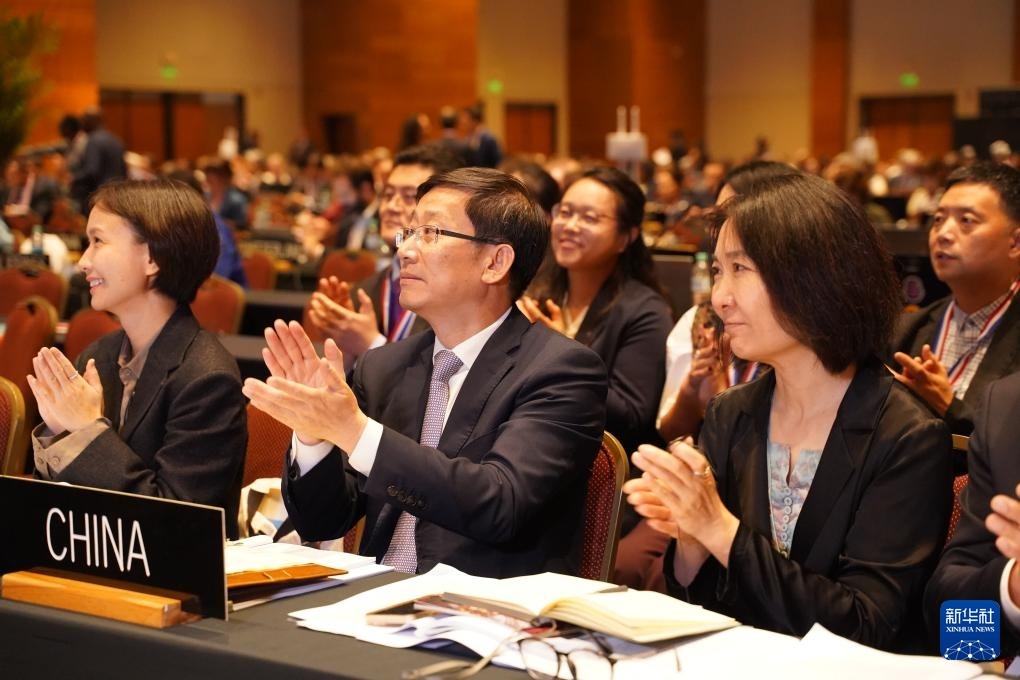 12月5日,在巴拉圭亞松森舉行的聯(lián)合國教科文組織保護非物質文化遺產(chǎn)政府間委員會第19屆常會現(xiàn)場,中國代表上臺領取證書。新華社記者 朱雨博 攝