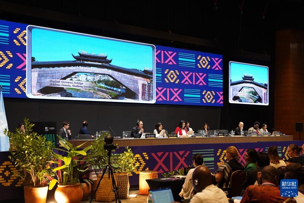 12月5日,在巴拉圭亞松森聯(lián)合國教科文組織保護非物質文化遺產(chǎn)政府間委員會第19屆常會評審現(xiàn)場,大屏幕播放“中國木拱橋傳統(tǒng)營造技藝”宣傳視頻。新華社記者 朱雨博 攝