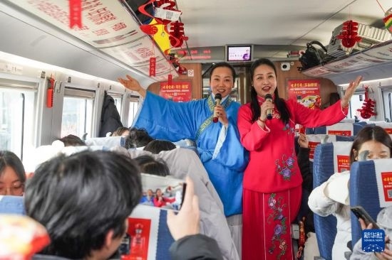 1月13日,在C3685次列車上,身著戲服的鐵路工作人員為旅客表演黃梅戲。