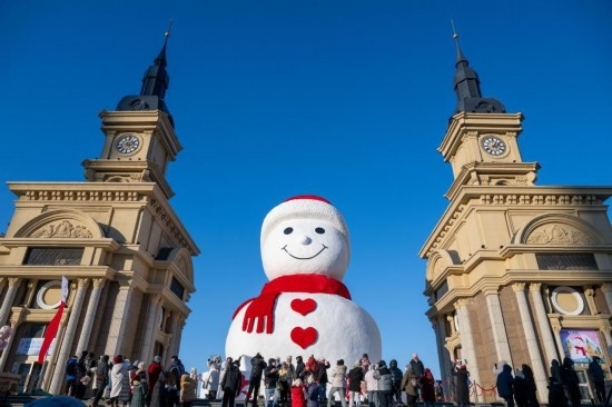 游客和市民在哈爾濱松花江畔的大雪人前游覽。新華社記者 張濤 攝