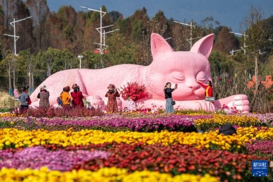 2月21日,游客在昆明市海洪莫奈花園與粉色貓咪雕塑合影。