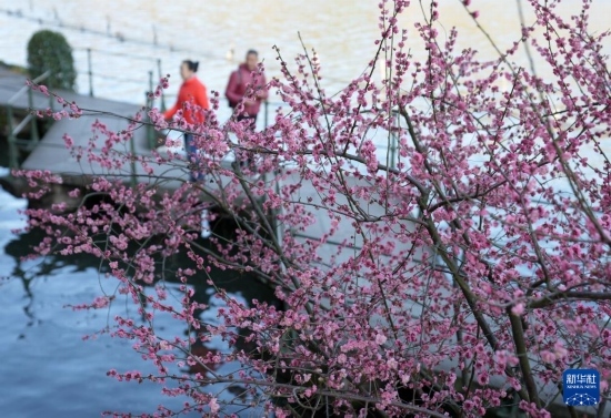 杭州西湖邊孤山一帶的梅花綻放(3月4日攝)。