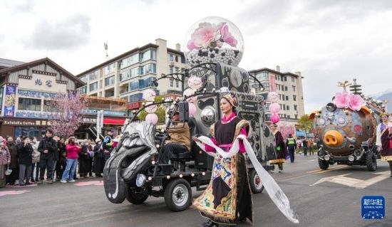 這是4月3日拍攝的林芝第二十二屆桃花旅游文化節(jié)花車巡游現(xiàn)場(chǎng)。