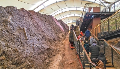 游客在重慶云陽(yáng)世界地質(zhì)公園參觀恐龍化石墻。